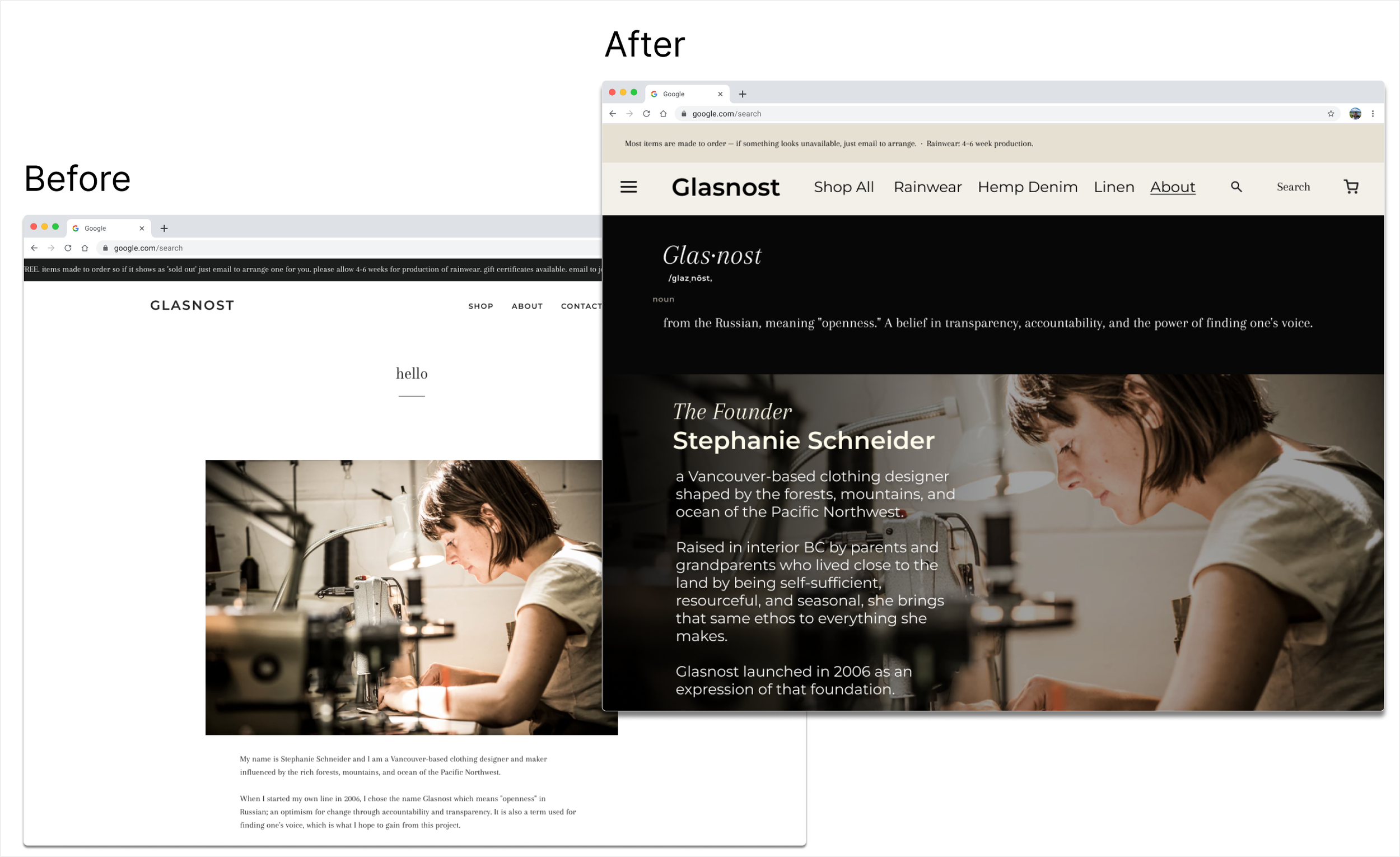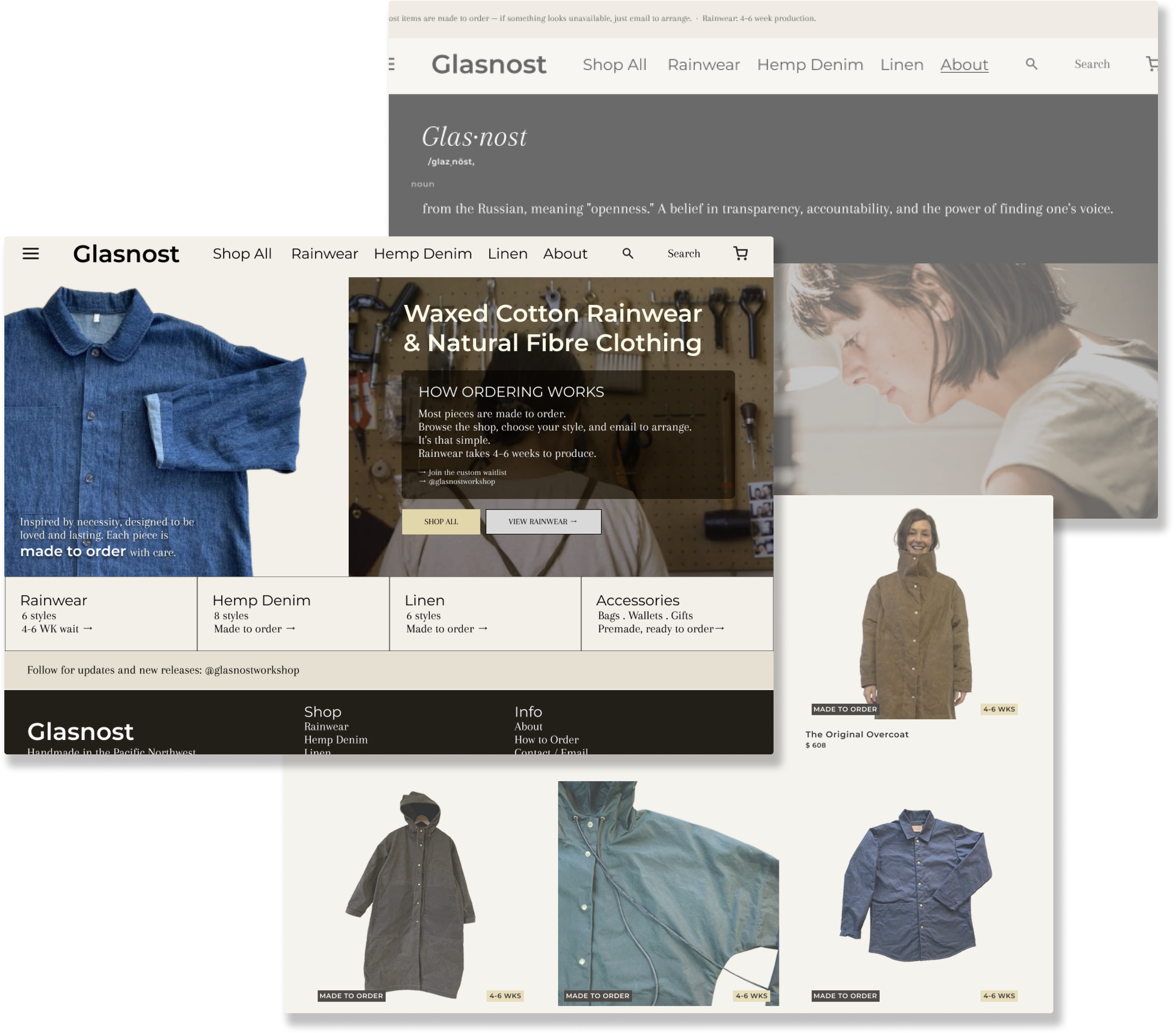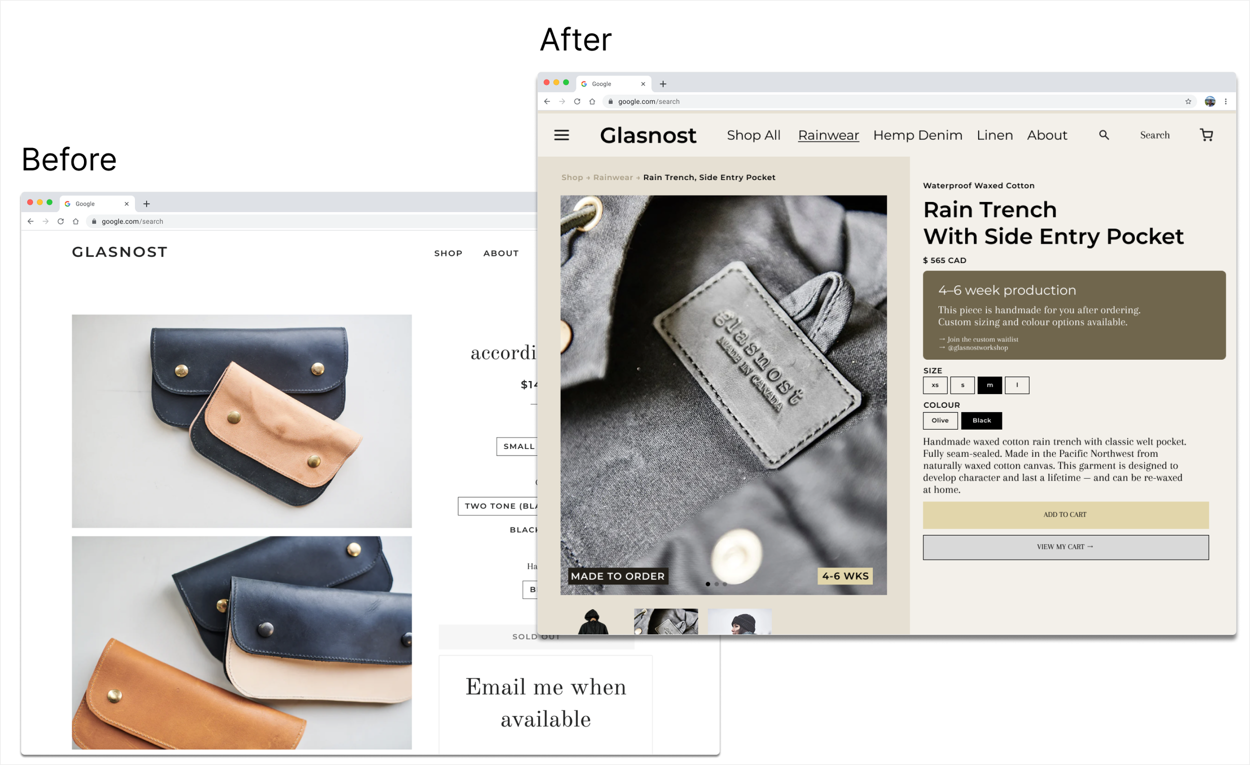 Glasnost makes handcrafted waxed cotton rainwear out of Vancouver. The clothes are exceptional, but the website was confusing to it's users.
