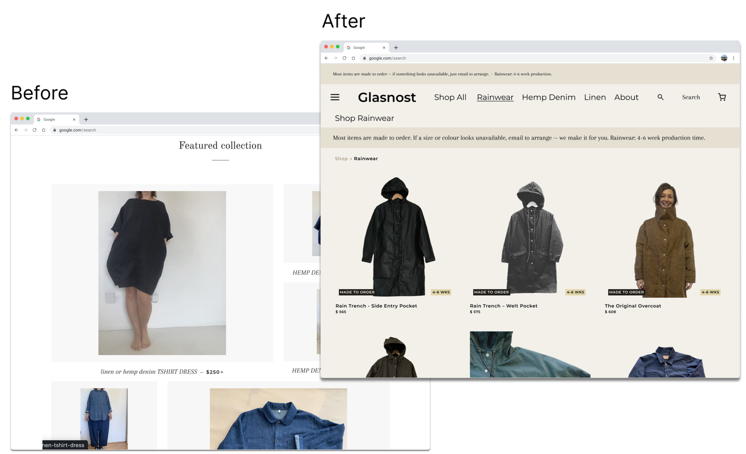 Shop - Category nav (Rainwear, Linen, Hemp Denim). Every made-to-order card is badged.